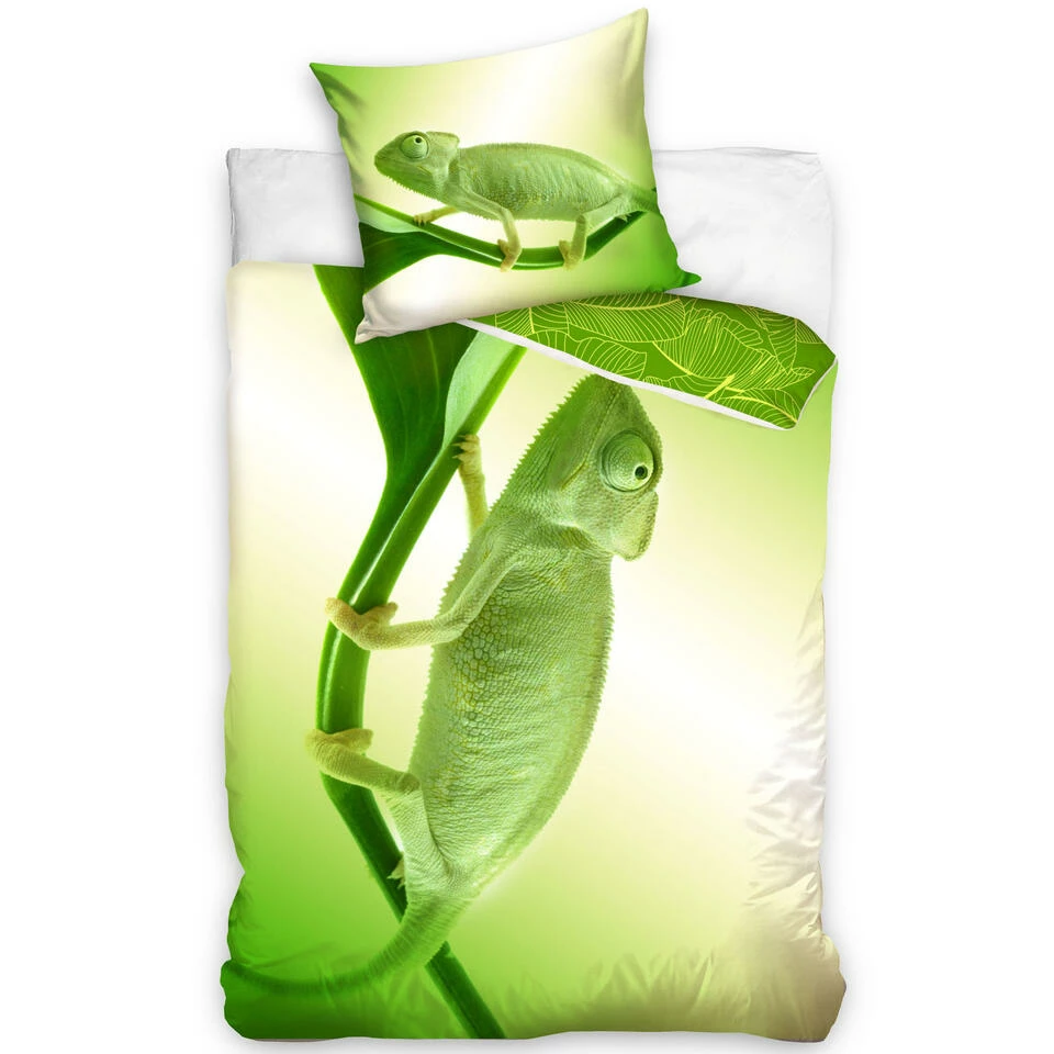 Animal Pictures Dekbedovertrek, Kameleon. Mooi eenpersoons katoenen dekbedovertrek met een afbeelding van een kameleon. Leuk voor een dieren-thema slaapkamer. De overtrek is tweezijdig bedrukt, wat een leuk effect geeft met het opmaken. Of gebruik hem tweezijdig. Wordt geleverd met extra groot kussensloop. Een leuk cadeau idee voor een verjaardag of de feestdagen.