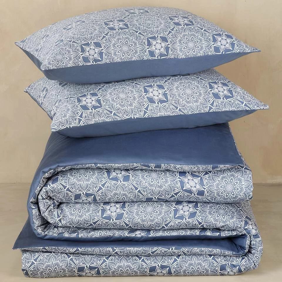 De Witte Lietaer Dekbedovertrek Katoen Satijn, Henna Blue Horizon. Prachtig satijn katoenen Lits Jumeaux met een hoge weefdichtheid. Het bedrukt bedlinnen is een lichtgewicht katoen-satijn dat ultra comfortabel aanvoelt door de satijnbinding, het gekamd katoen en de extra zijdeglans. Het dekbedovertrek, alsook de kussenslopen, zijn dubbelzijdig en dus omkeerbaar. Het dekbedovertrek heeft een wijde flessenhals -behalve voor de Duitse maten- en kan daardoor makkelijk over het dekbed getrokken worden. De Witte Lietaer staat bekend om hun kwaliteitsproducten en rijke geschiedenis. Kortom, met een product van De Witte Lietaer koopt u een voortreffelijke ervaring.