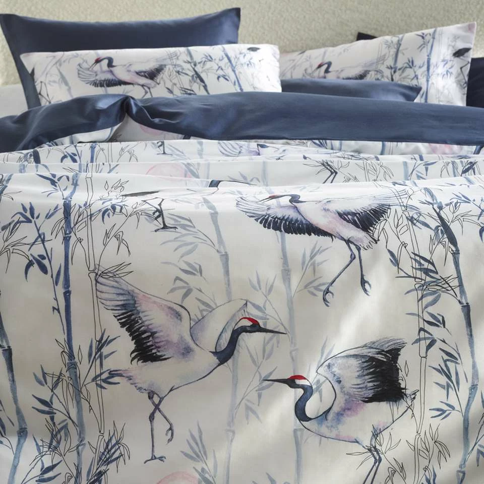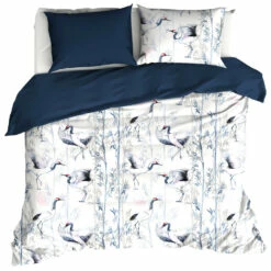 De Witte Lietaer Dekbedovertrek, Mont Blanc Majolica Blue. Prachtig lits jumeaux satijn katoenen dekbedovertrek met een hoge weefdichtheid. Het bedlinnen is een lichtgewicht katoen-satijn dat ultra comfortabel aanvoelt door de satijnbinding, het gekamd katoen en de extra zijdeglans. De hoge weefdichtheid zorgt er tevens voor dat de stof glad aanvoelt. Het dekbedovertrek en de kussenslopen zijn dubbelzijdig en dus omkeerbaar. Op de voorkant staat een dessin van kraanvogels en bamboe en de achterzijde heeft een effen kleur. Door de extra wijde flessenhals is de hoes makkelijk over het dekbed te trekken. De Witte Lietaer staat bekend om hun kwaliteitsproducten en rijke geschiedenis. Kortom, met een product van De Witte Lietaer koopt u een voortreffelijke ervaring.