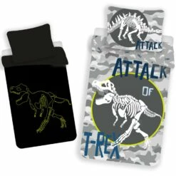 Dinosauraus dekbedovertrek, T-rex Glow in the Dark. Stoer katoenen eenpersoons dekbedovertrek van een welbekende dinosaurus: de Tyrannosaurus Rex! Dit dekbedovertrek is glow in the dark, als er voldoende licht op valt blijven elementen uit het design nagloeien in het donker! Een fantastisch cadeau voor de kleine archeoloog.