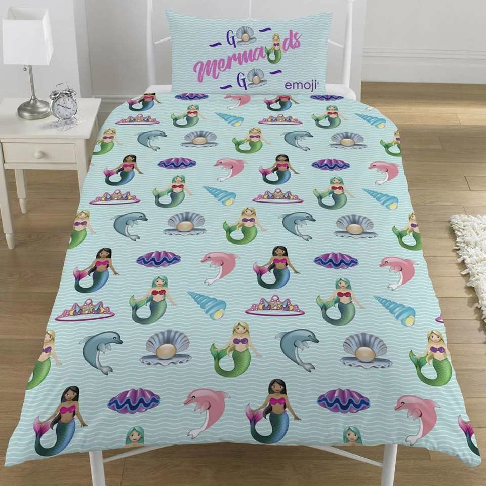 Emoji Dekbedovertrek Unicorns & Mermaids. Super leuk en schattig dekbedovertrek met al je favoriete Emoji’s erop. Op de bovenzijde zijn eenhoorn, bloemen, ijsjes, lolly en sterren Emoji’s op een zacht roze achtergrond afgebeeld. De binnenzijde heeft een zeemeerminnen thema met zeemeermin, dolfijn, schelp en tiara Emoji’s. Je kan dus het dekbedovertrek en het kussensloop omdraaien als je eens wat anders wilt, erg handig en het staat ook nog eens mooi.