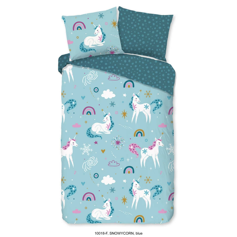 Dekbedovertrek “Snowycorn” van Good Morning met eenhoorns en regenbogen, in de kleur “Blauw” is gemaakt van 100% geruwde 100% Cotton/ Flannel. Deze warme, zachte stof is zeer geschikt voor de wintermaanden, ademend en vocht absorberend.