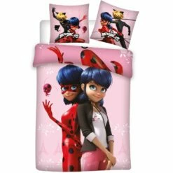 Miraculous Dekbbedovertrek, Duo. Altijd klaar voor avontuur, altijd klaar om te helpen. Overdag een normaal meisje, als de wereld haar nodig heeft een superheld. Welk avontuur beleeft zij vannacht? Droom het zelf bij elkaar onder dit eenpersoons katoenen Miraculous dekbedovertrek.