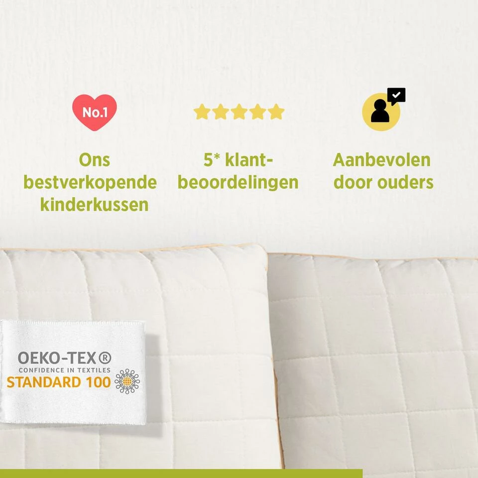 Het My First Pillow is één van de bestverkochte kinderkussens en zorgt voor de meest rustgevende slaap van uw kind. Het biedt uitstekende ondersteuning in alle slaaphoudingen voor de ruggengraat en de nek van je kind. Het kussen is geschikt voor kinderen vanaf 1 jaar. Door de verstelbare hoogte en stevigheid kan het kussen “meegroeien” met de leeftijd van het kind. De combinatie van ongebleekt katoen en natuurlijke bamboevezels in de kussensloop zijn speciaal ontwikkeld voor de gevoelige huid.