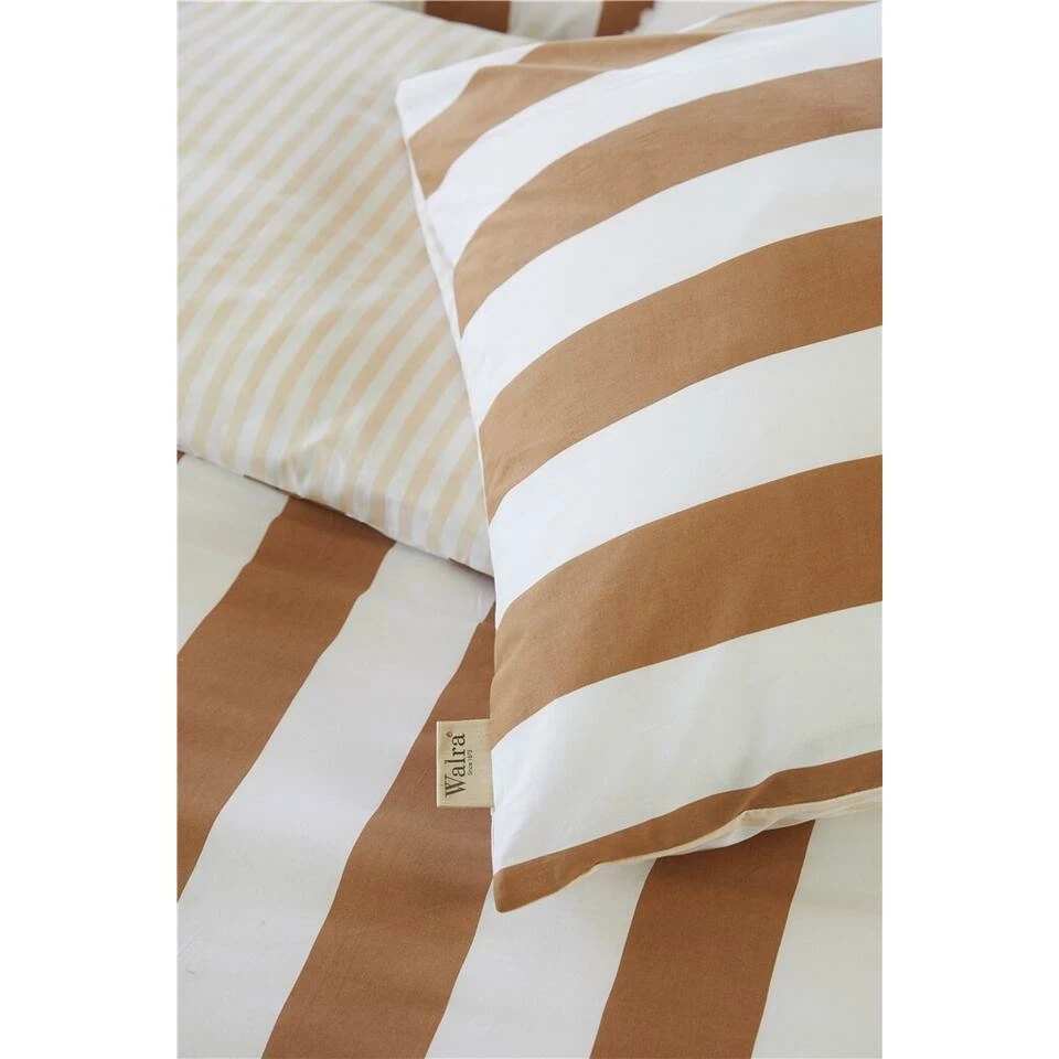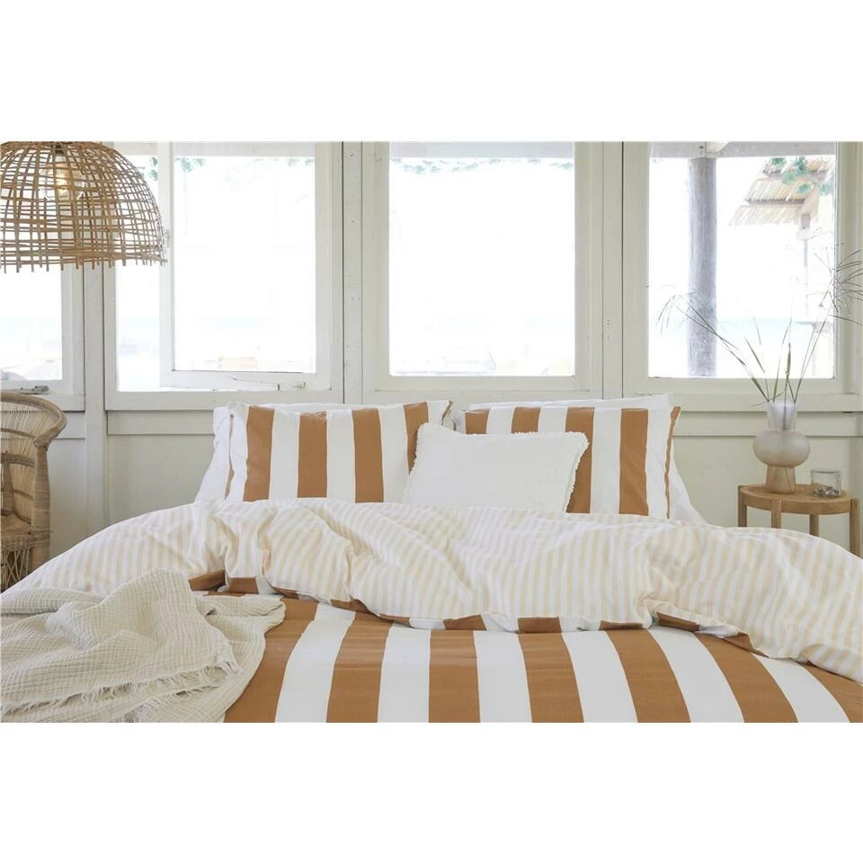 Het dekbedovertrek Classic Stripe doet je helemaal denken aan een dag op het strand. De verticale brede strepen aan de voorkant in de cognac kleur en subtiele dunne lijntjes aan de achterzijde in een lichtere cognac kleur zijn geïnspireerd op de trend Coastal Living.